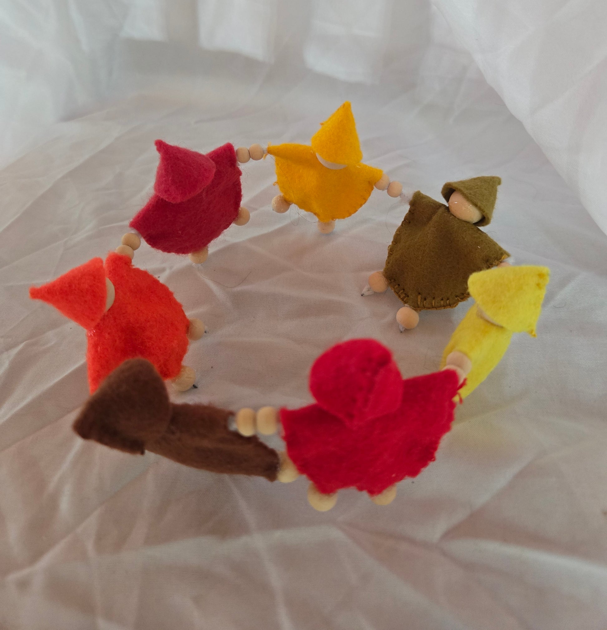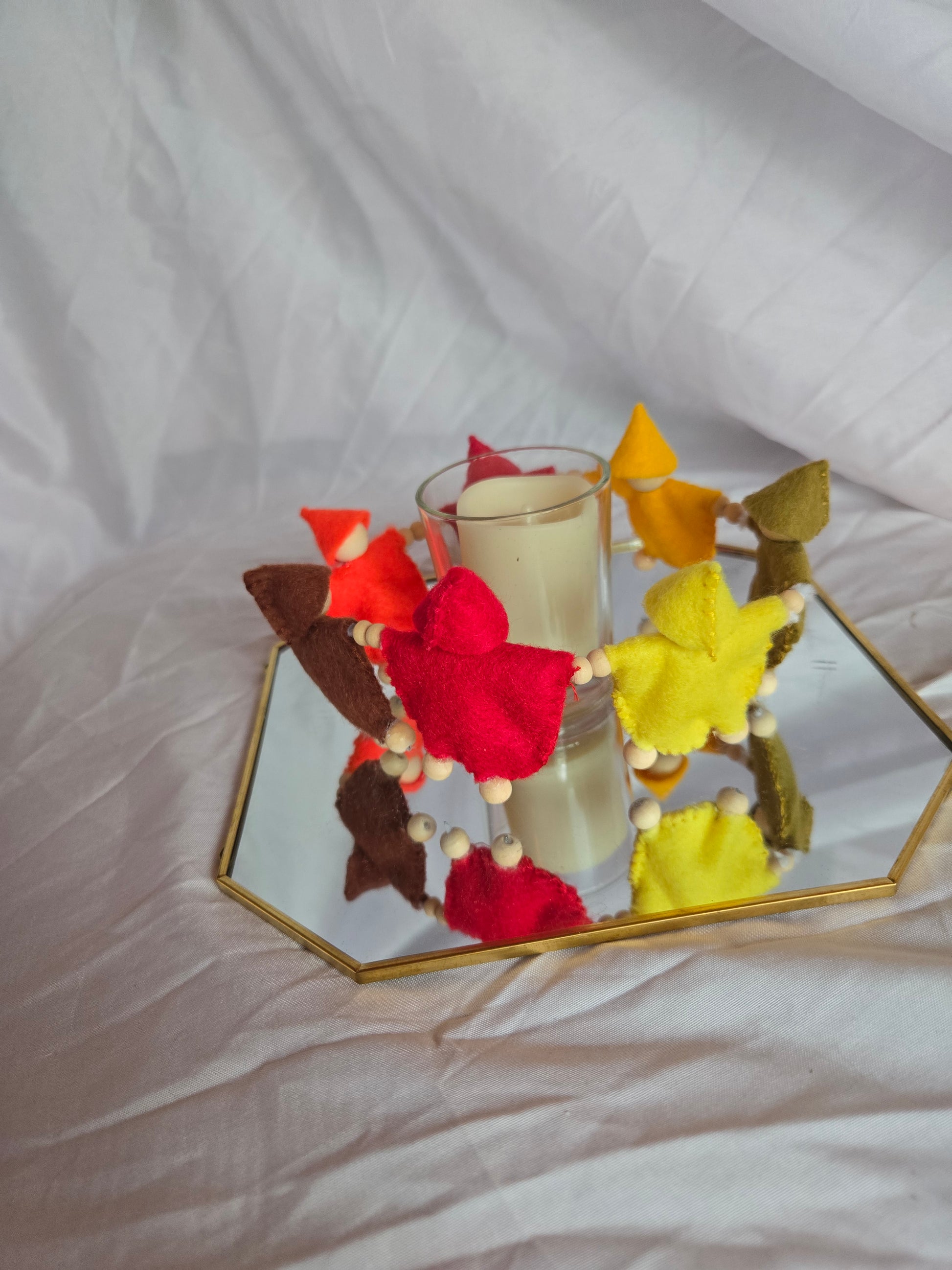 These adorable candle rings will be a conversation starter for any room. They are made with colorful mini sprites all holding hands to form a circle. They can be used with pillar candles as well as votives. (candles not included) When summer is over, this sweet autumn colored ring will help with the transition into fall.