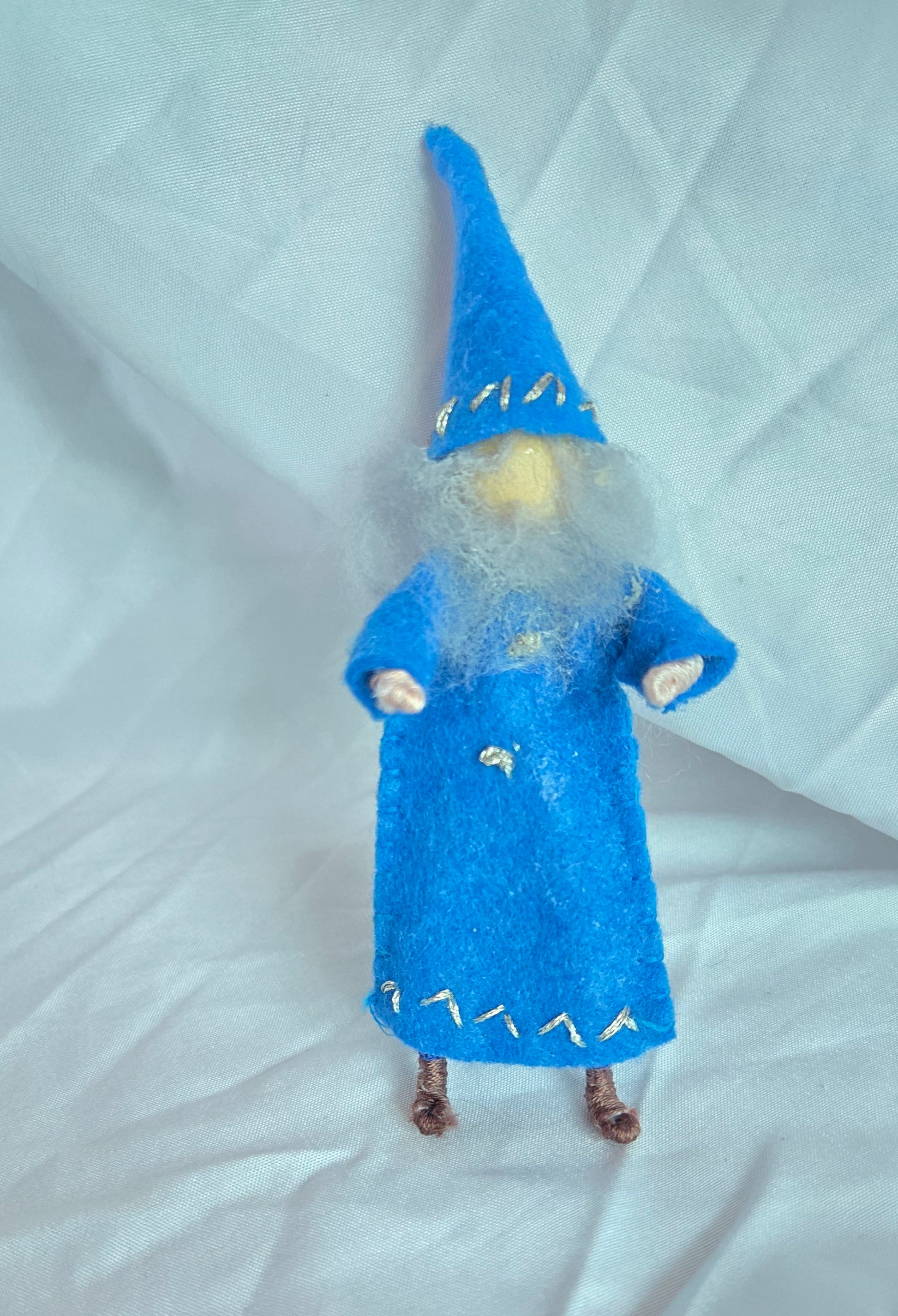 These sweet little dolls are perfect for a doll house family or visiting characters. They are between 4" and 5" depending on their headwear. More family members are coming soon! This little blue wizard with a grey wool beard is a perfect visitor to a doll house family.