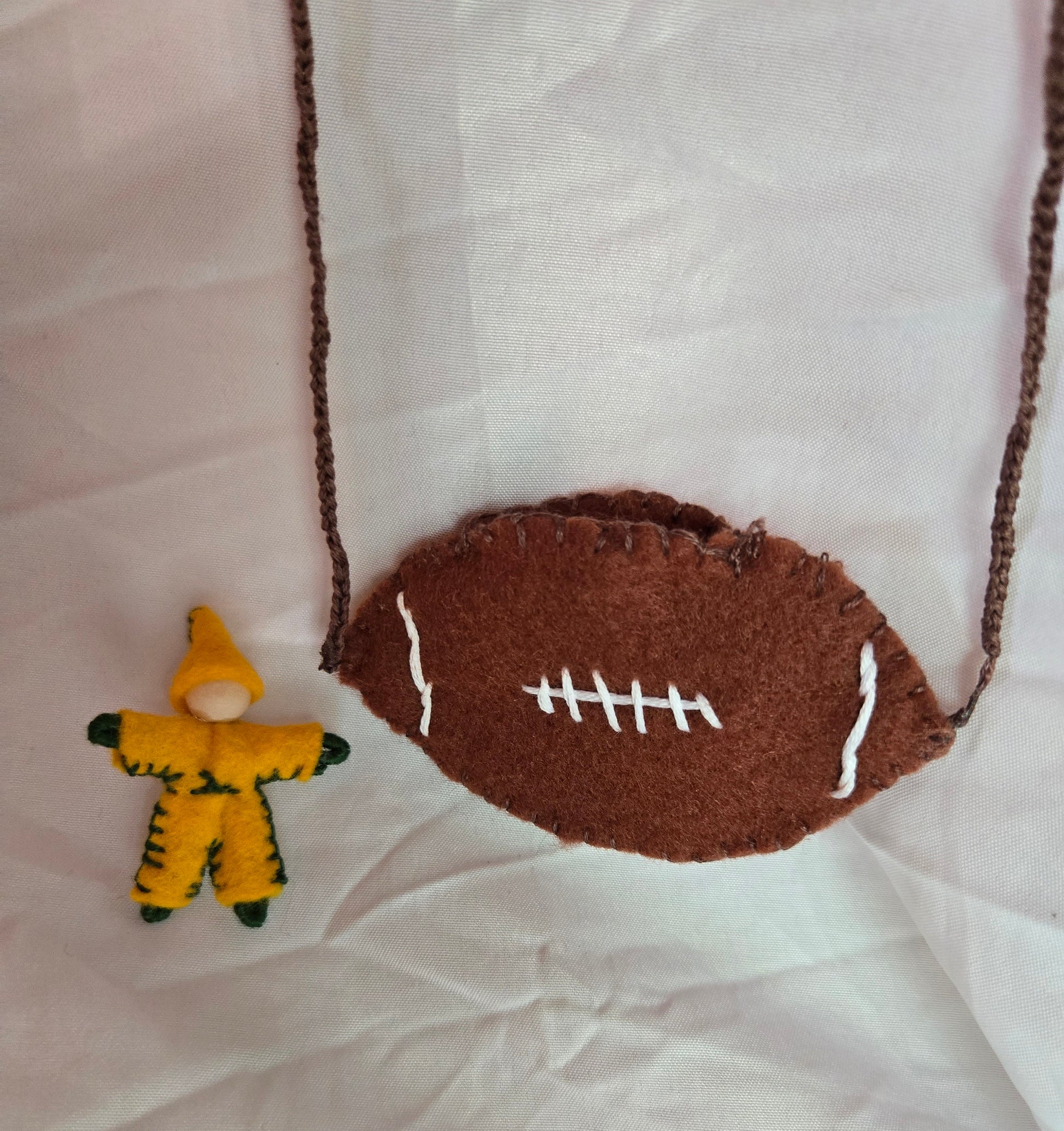 These whimsical little necklaces have a tiny doll to take out and play with! The necklaces are approximately 2 1/2" and are made in a variety of shapes. Each one has embroidery decorations and a 1 1/2' doll in a coordinating color. This football necklace has a tiny little gold and green gnome. (Go Packers!)