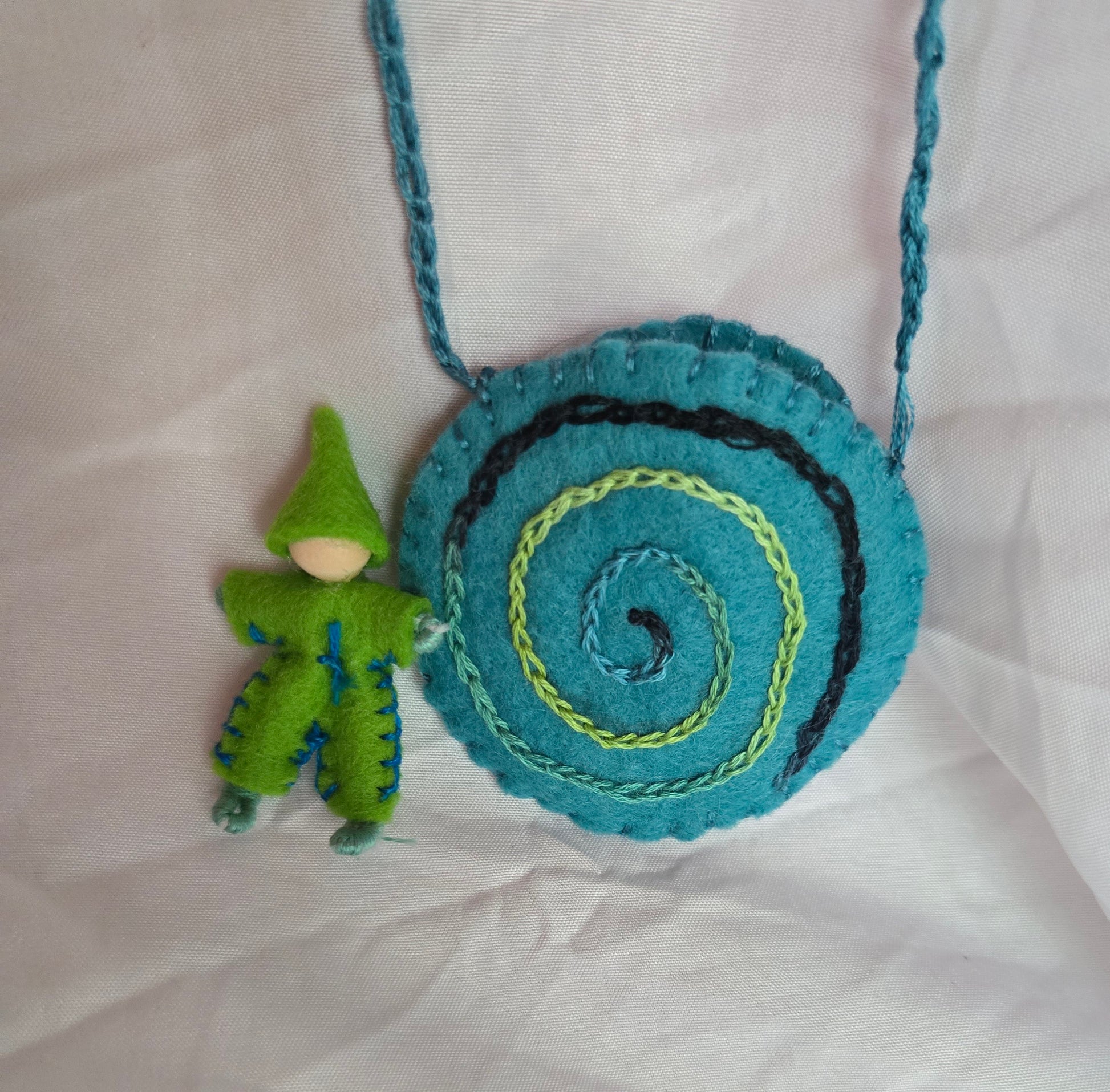 These whimsical little necklaces have a tiny doll to take out and play with! The necklaces are approximately 2 1/2" and are made in a variety of shapes. Each one has embroidery decorations and a 1 1/2' doll in a coordinating color. This little green necklace has a variegated spiral embroidered on the front and a little green gnome.