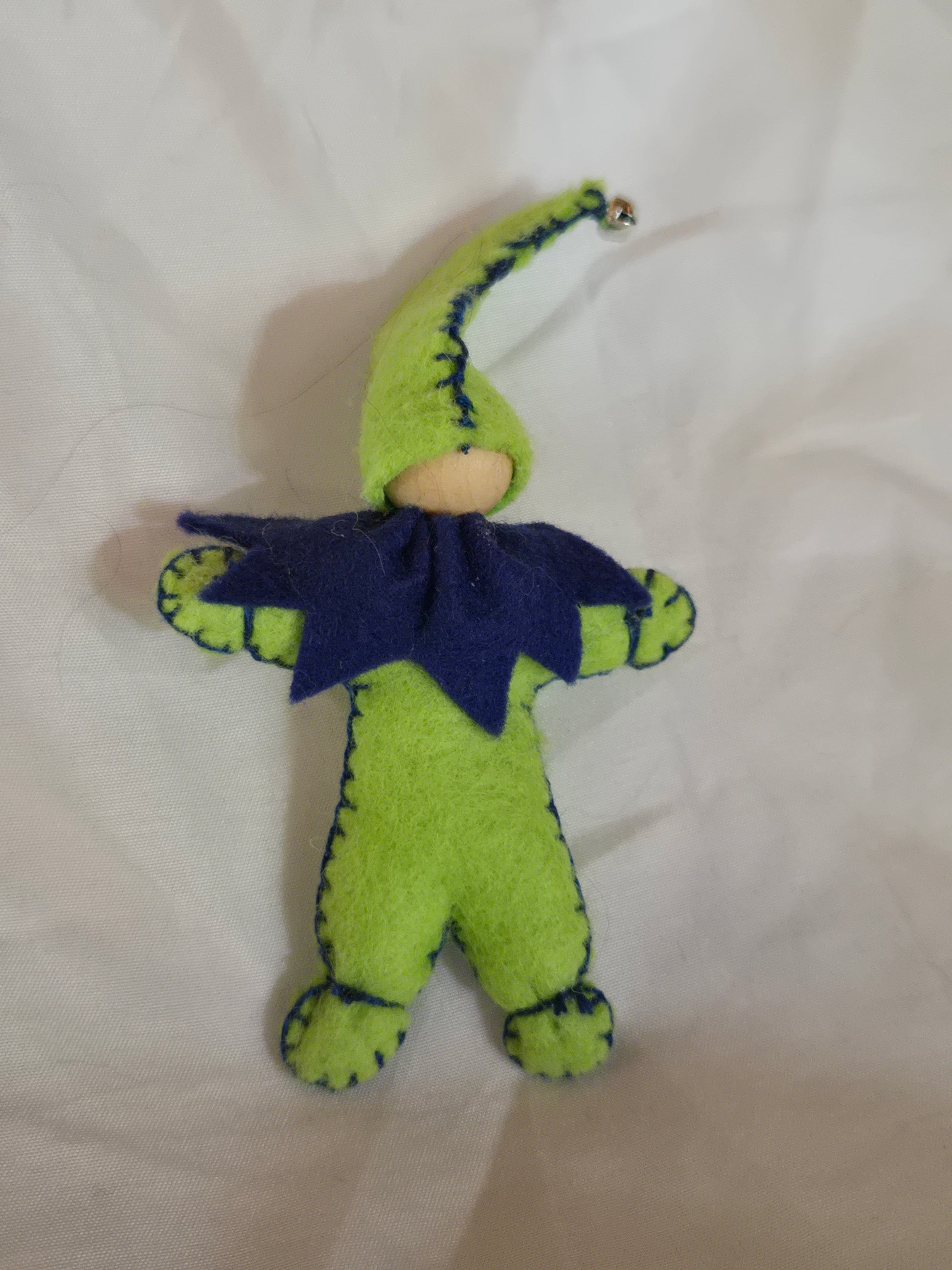 These sweet little friends will bring lots of fun for any age. They are made with wool blend felt and 100% wool stuffing. These little creatures have a wooden head. Each gnome measures approximately 5" from tippy top of the cap all the way down to its toes, and with arms open wide they are about 2.5 inches across. This gnome was made in a lime green with a matching cap and coordinating collar. The gnomes are hand made in Wisconsin.