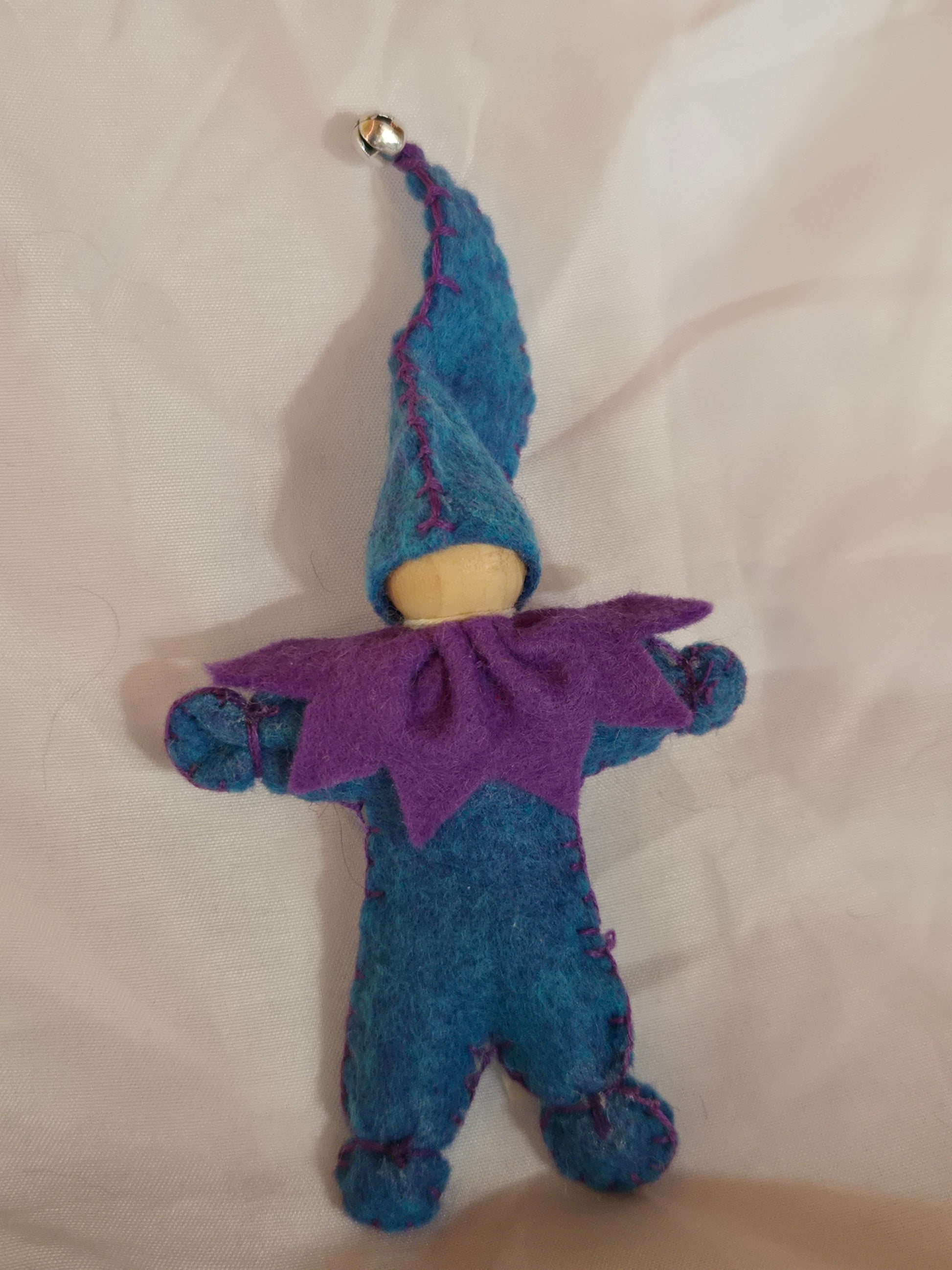 These sweet little friends will bring lots of fun for any age. They are made with wool blend felt and 100% wool stuffing. These little creatures have a wooden head. Each gnome measures approximately 5" from tippy top of the cap all the way down to its toes, and with arms open wide they are about 2.5 inches across. This little gnome was made in blue with a matching cap and coordinating collar. The gnomes are hand made in Wisconsin.